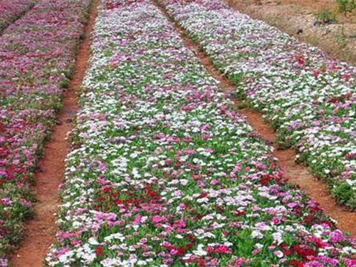 石竹株型低矮,莖稈似竹,葉叢青翠,自然花期5-9月,從暮春季節(jié)可開至仲秋,溫室盆栽可以花開四季。花頂生枝端,單生或成對,也有呈圓錐狀聚傘花序,花徑不大,僅2至3厘米,但花朵繁茂,此起彼伏,觀賞期較長。花色有白、粉、紅、粉紅、大紅、紫、淡紫、黃、藍(lán)等,五彩繽紛,變化萬端。園林中可用于花壇、花境、花臺或盆栽,也可用于巖石園和草坪邊緣點(diǎn)綴。大面積成片栽植時(shí)可作景觀地被材料,另外石竹有吸收二氧化硫和氯氣的本領(lǐng),凡有毒氣的地方可以多種。切花觀賞亦佳。